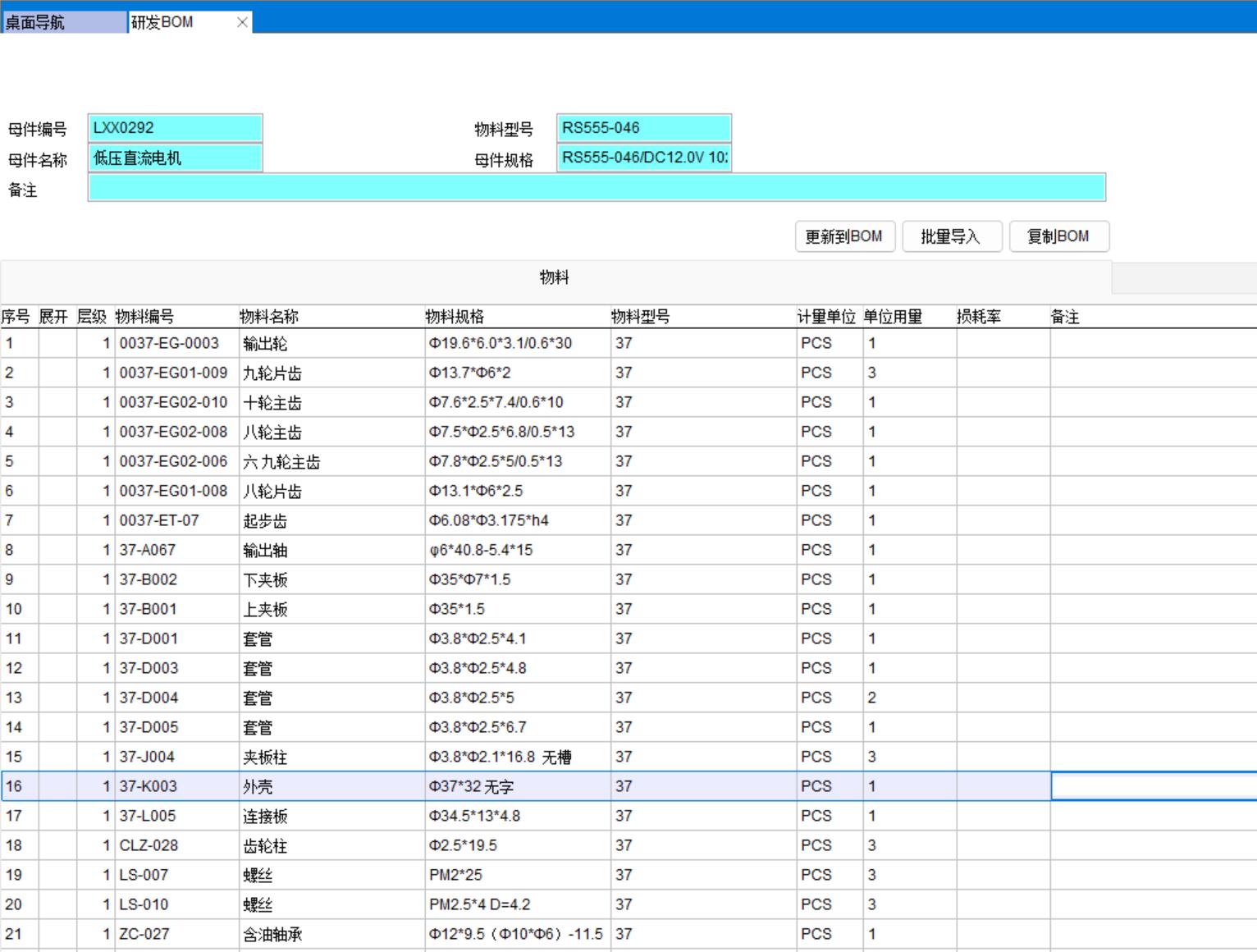 我們從最基本的講起什么是BOM,BOM就是組成產(chǎn)品的物料清單,比如產(chǎn)成品是汽車,那么汽車的BOM如下:發(fā)動機(1個)、地盤(1個)、車身(1個)、輪胎(4個)。。。,括號中是單個用量。為什么會有BOM存在呢?這是因為采用計算機輔助企業(yè)生產(chǎn)管理,首先要使計算機能夠讀出企業(yè)所制造的產(chǎn)品構(gòu)成和所有要涉及的物料,為了便于計算機識別,必須把用圖示表達的產(chǎn)品結(jié)構(gòu)轉(zhuǎn)化成某種數(shù)據(jù)格式,這種以數(shù)據(jù)格式來描述產(chǎn)品結(jié)構(gòu)的文件就是物料清單,即是BOM。它是定義產(chǎn)品結(jié)構(gòu)的技術文件,因此,它又稱為產(chǎn)品結(jié)構(gòu)表或產(chǎn)品結(jié)構(gòu)樹。在某些工業(yè)領域,可能稱為“配方”、“要素表”或其它名稱。