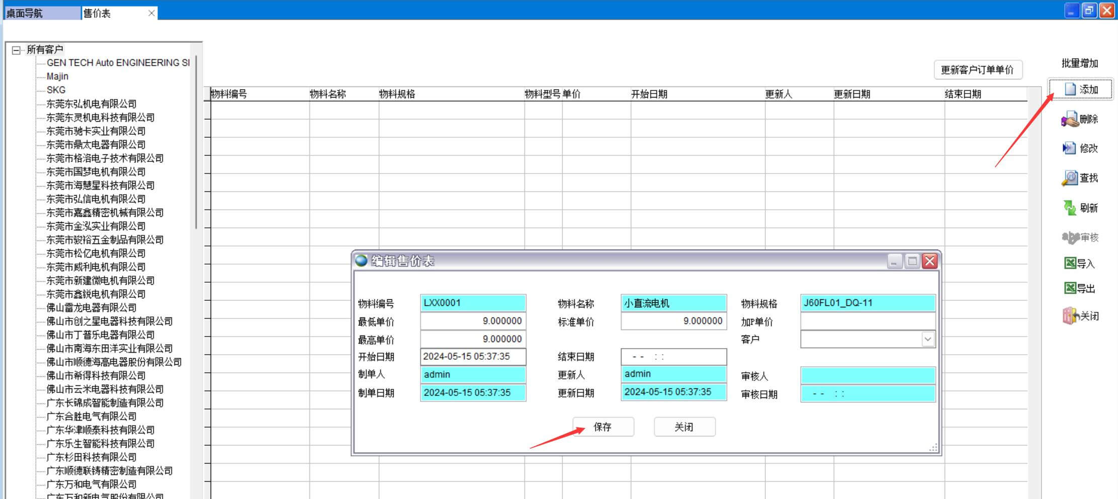 點添加,輸入物料編號、最低單價、最高單價、標準單價,點保存