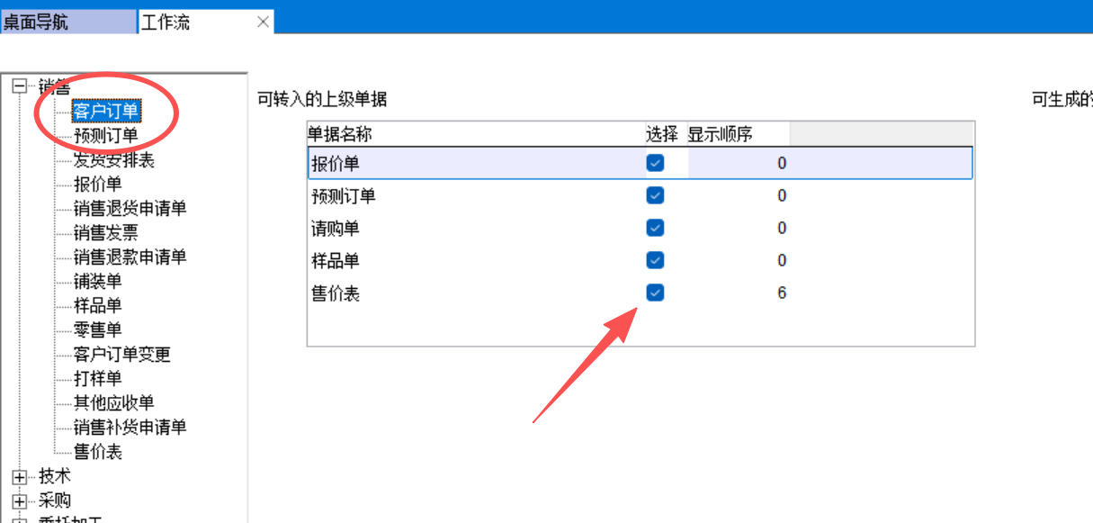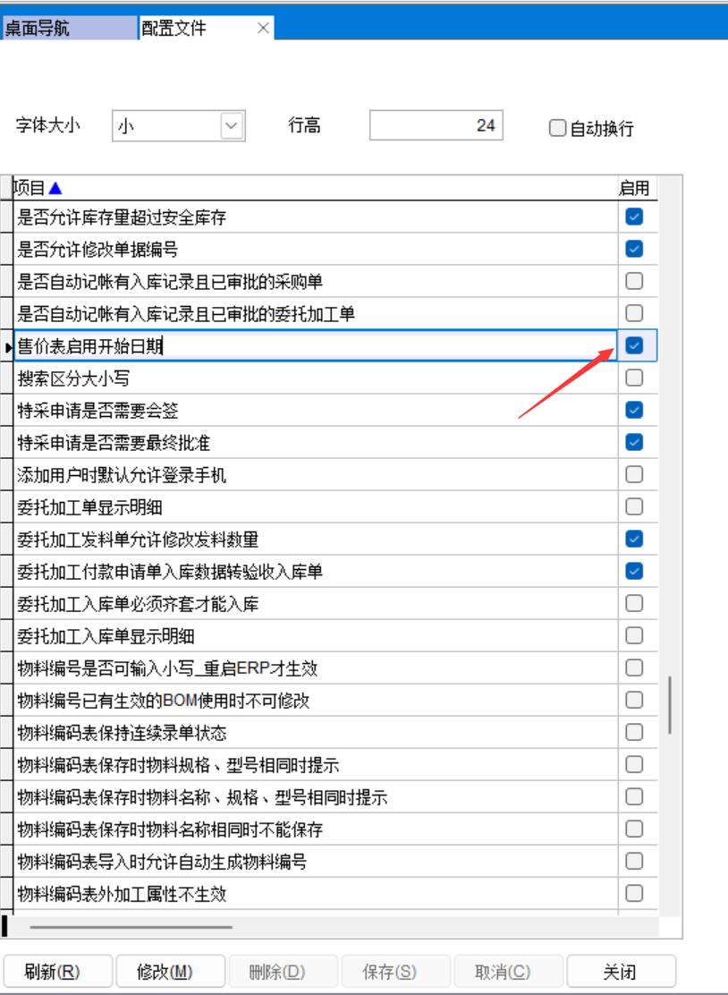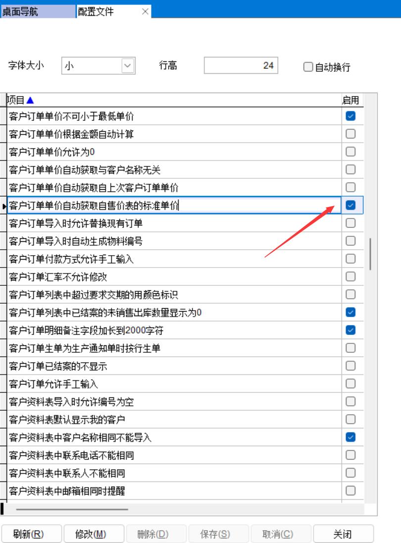 配置文件中,勾選客戶訂單單價自動獲取自售價表的標準單價,保存后重新登錄ERP生效。