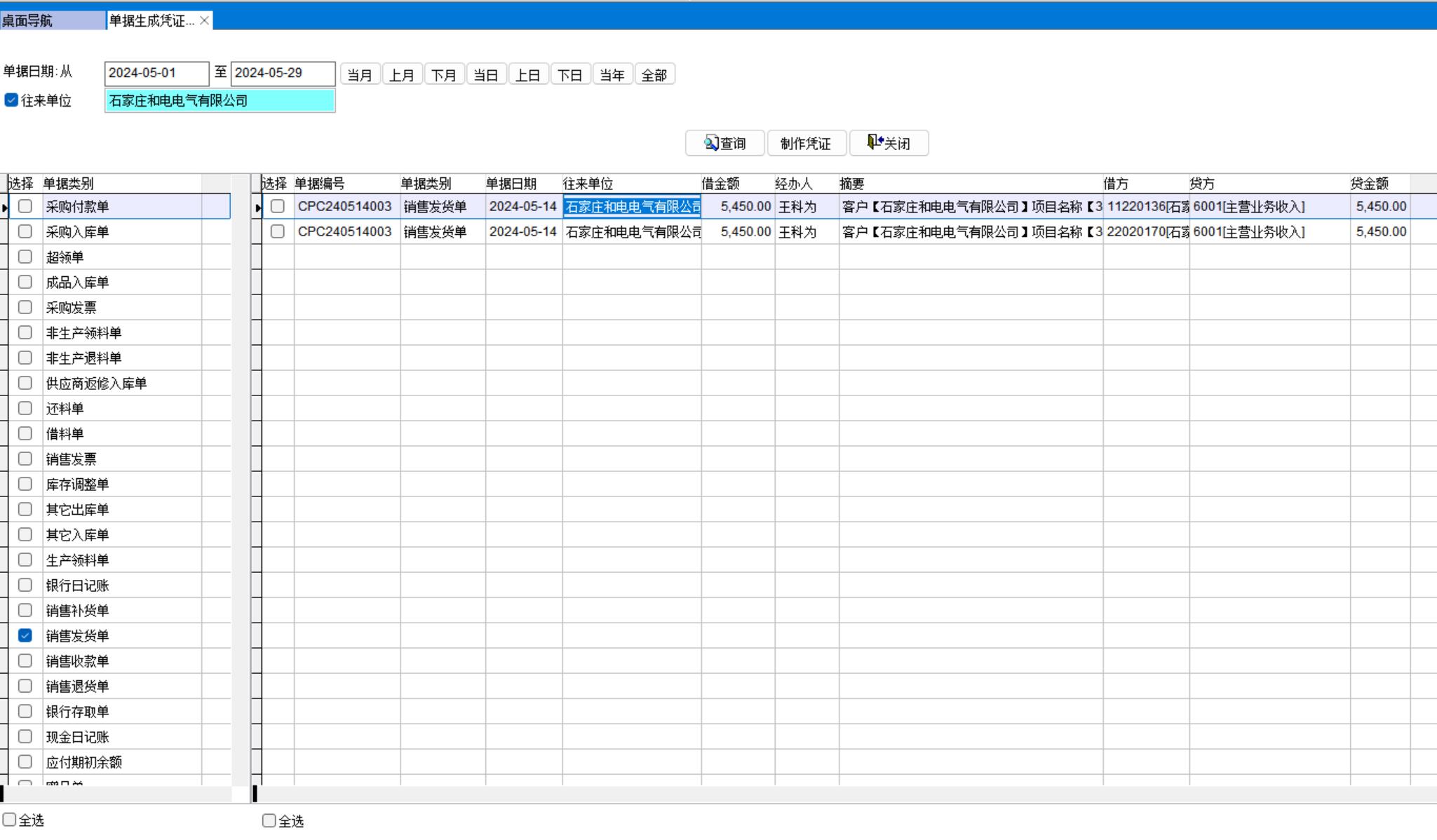 單據(jù)生成憑證中只勾選銷售發(fā)貨單,點(diǎn)制作憑證即可