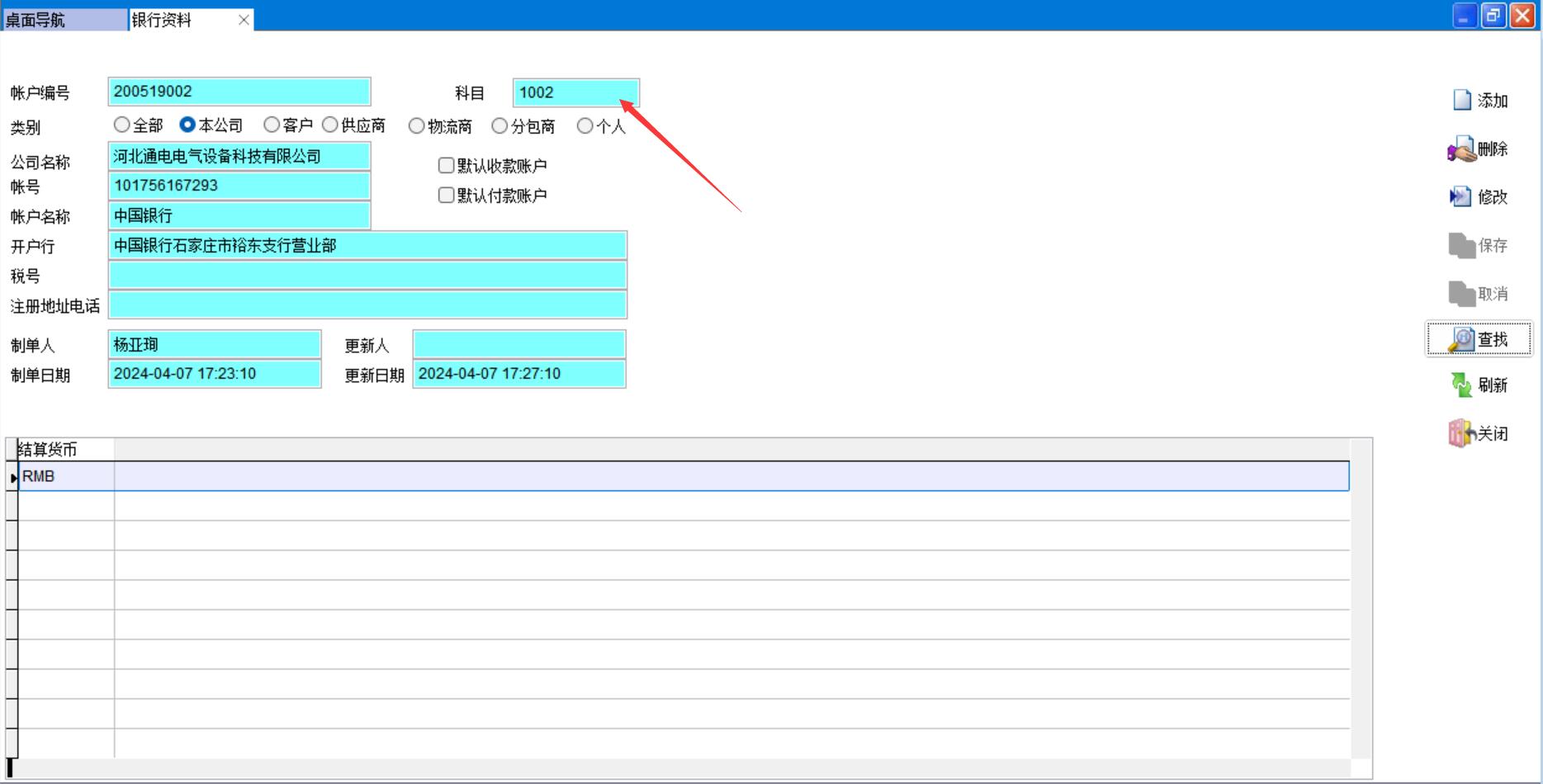 那么貸方科目是怎么出現的呢,從采購付款單可以看出,付款賬戶是中國銀行,在基本資料-銀行資料中我們設置了中國銀行的科目,這個就是貸方科目。因此貸方科目不是固定的,根據采購付款單中從哪個賬戶付款決定。