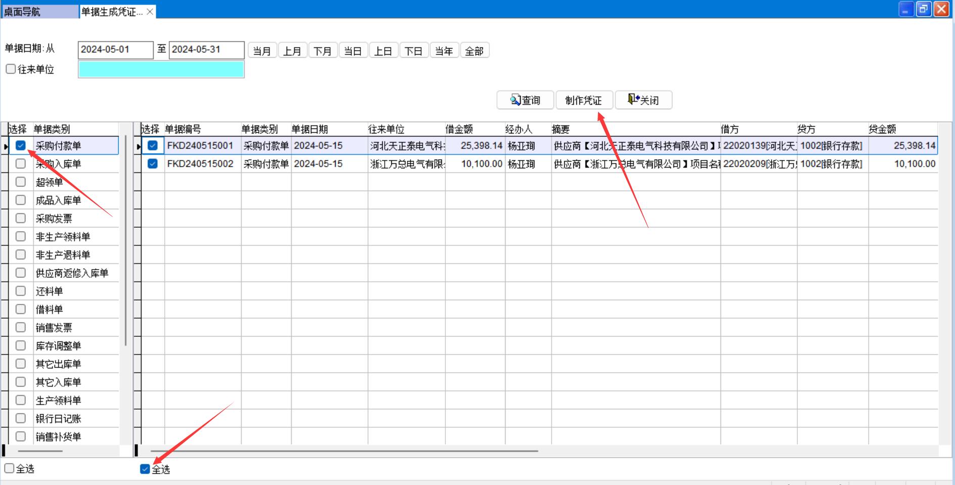 單據生成憑證中只勾選采購付款單,點制作憑證即可
