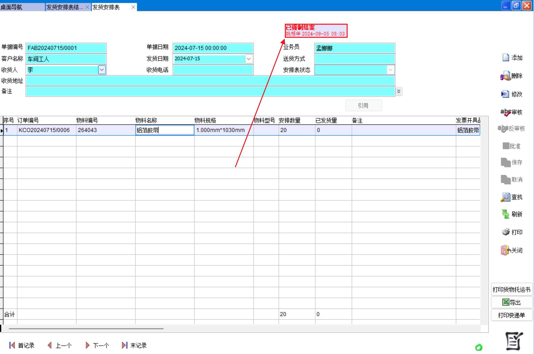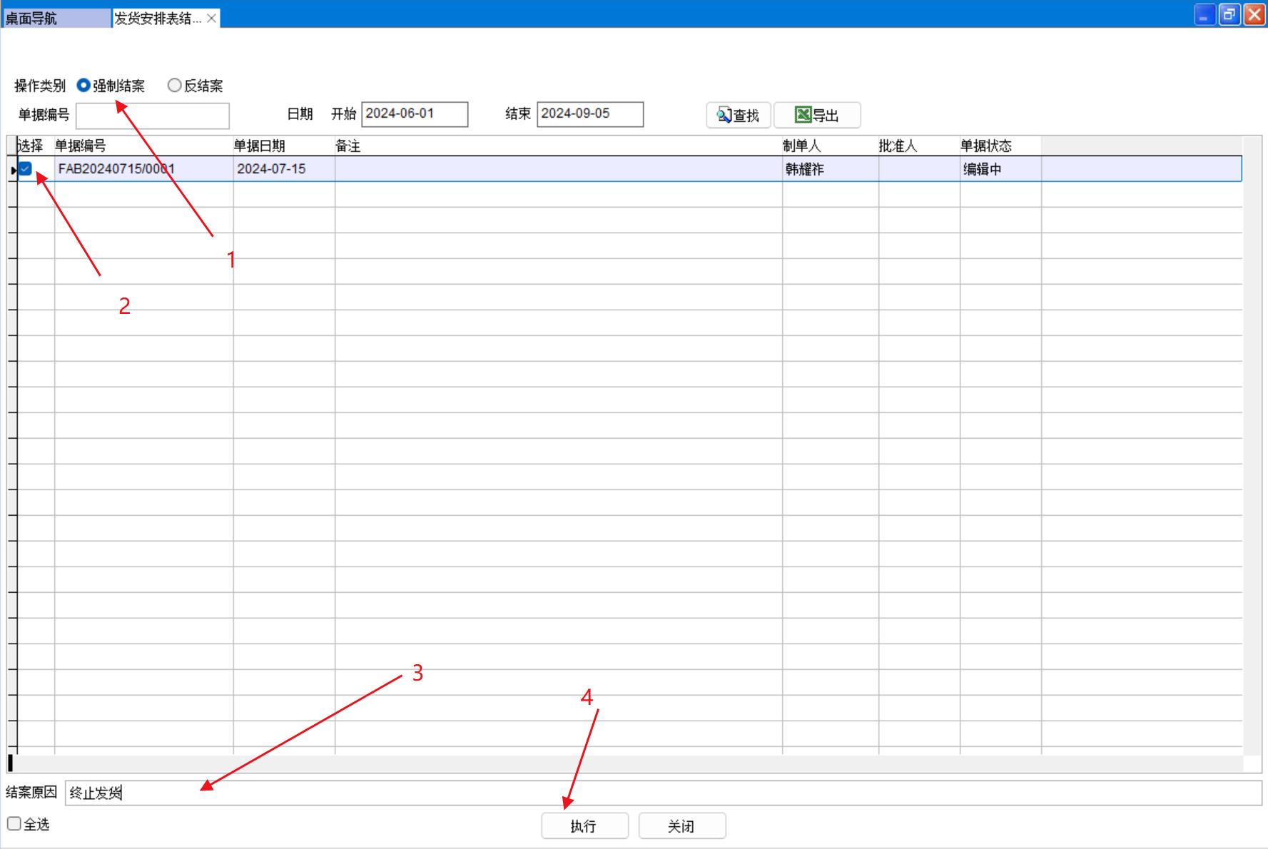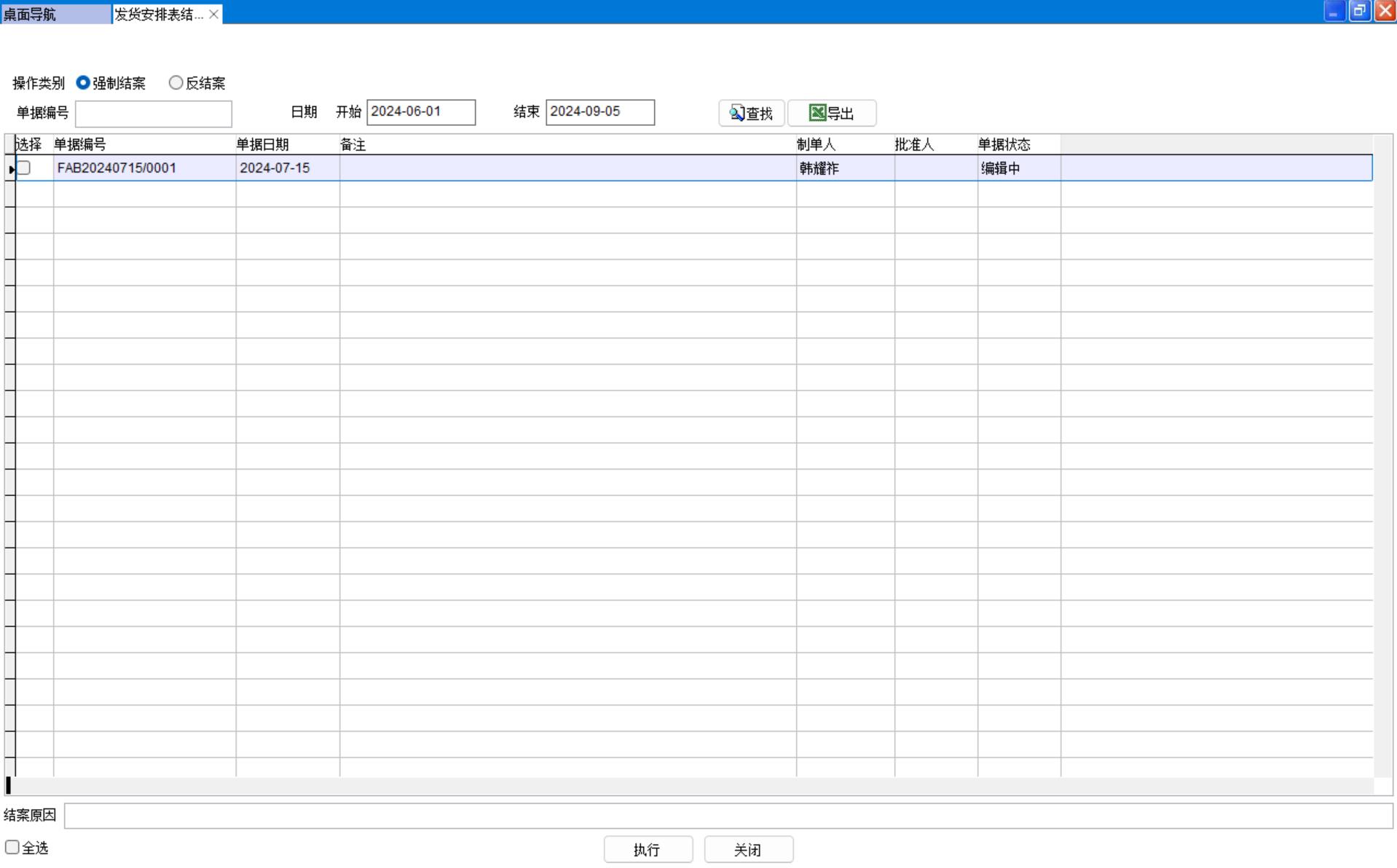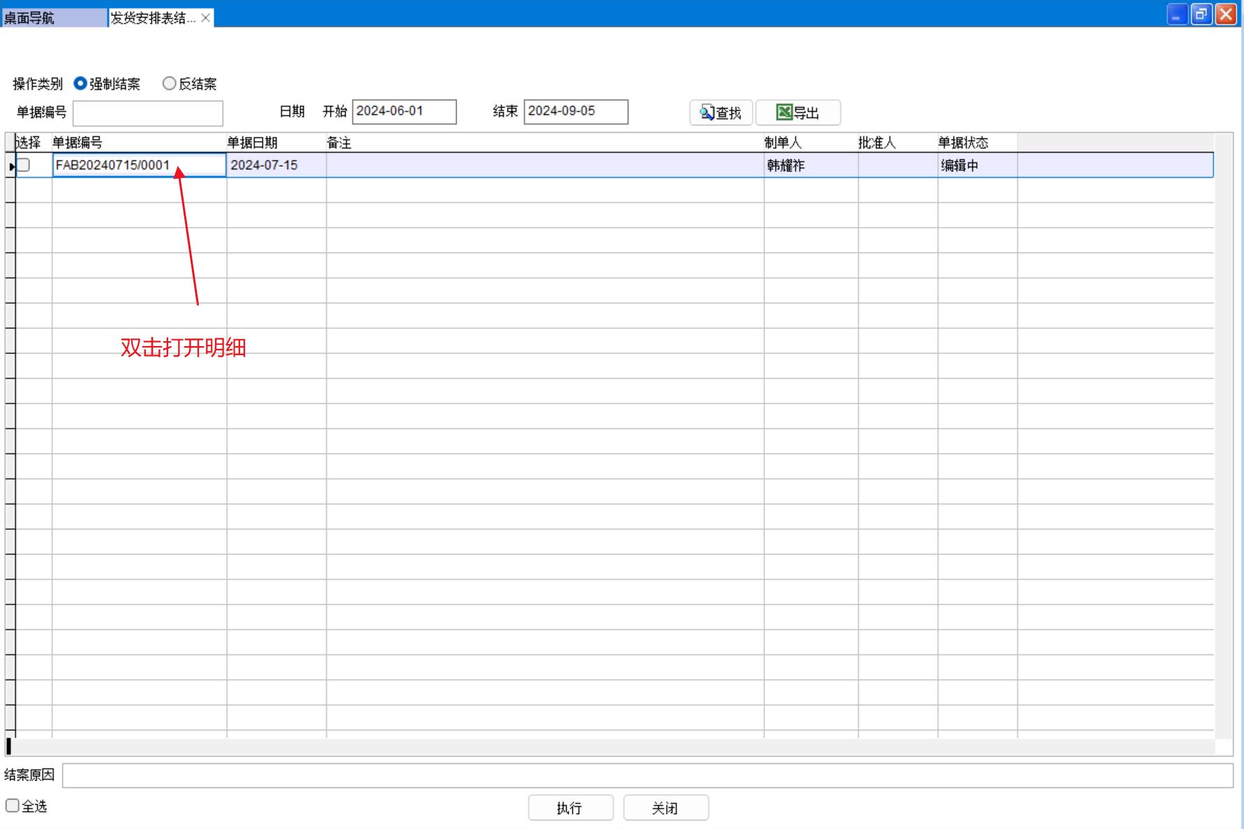 打開路徑:【主菜單】-【銷售】-【發貨安排表】-【發貨安排表結案】