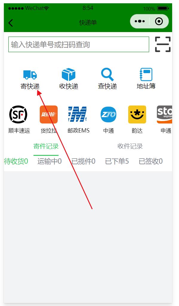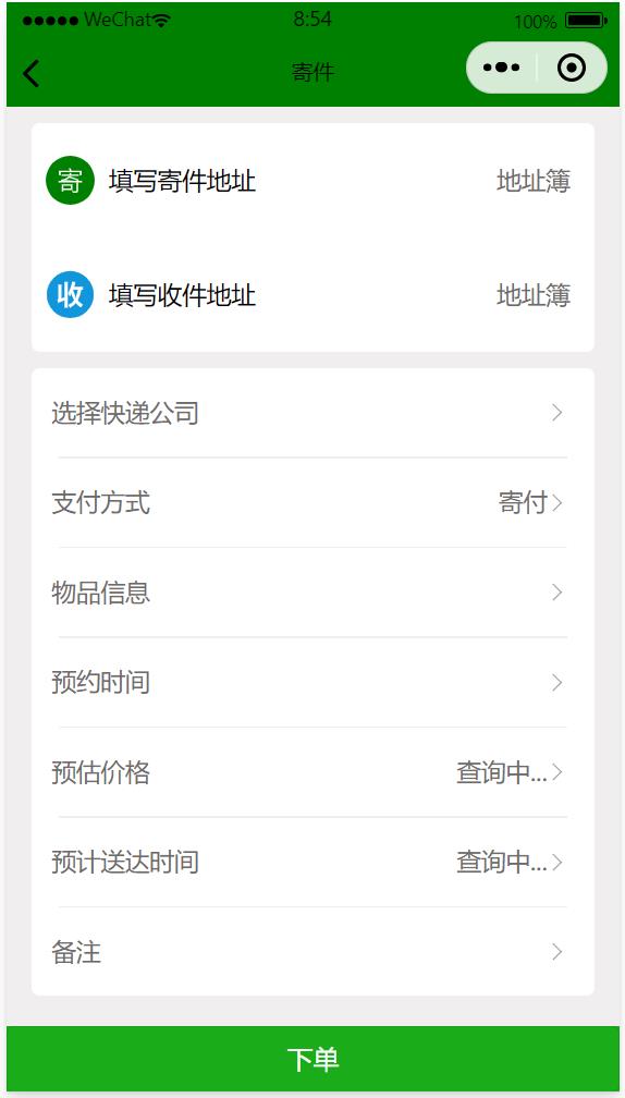 在微信小程序中寄快遞,地址簿可以提前輸入進去,用戶寄快遞時只要選擇在地址簿中選擇就可以,如果是新地址可以手工填寫,填寫后會自動保存在地址簿中,下次就不用再手工填寫了。