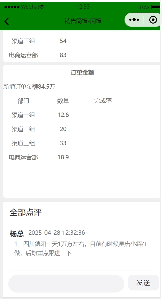 銷售周報包含銷售訂單金額、新增銷售線索數量、新增銷售機會數量,領導可以對周報進行點評。