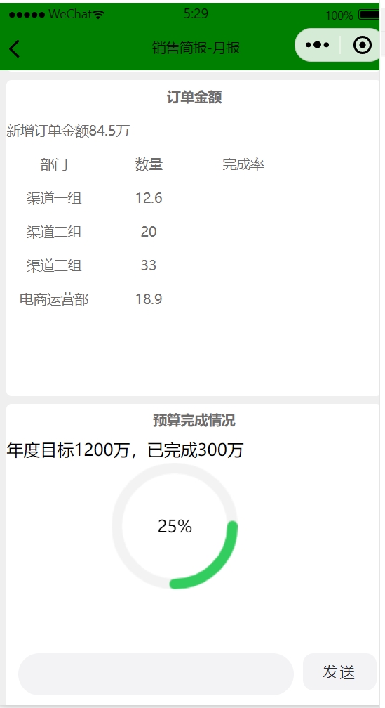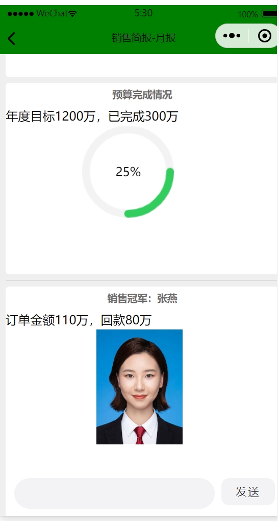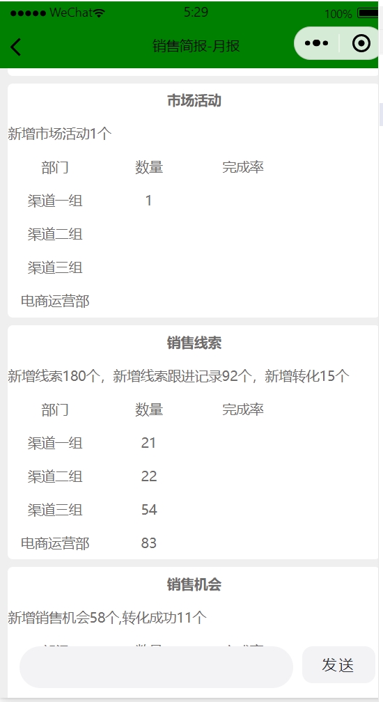 銷售月報內容會更加全名,方便在月度會議上展示。顯示內容包括銷售訂單金額、新增銷售線索數量、新增銷售機會數量、訂單top10客戶、銷售預算完成情況、銷冠數據等。
