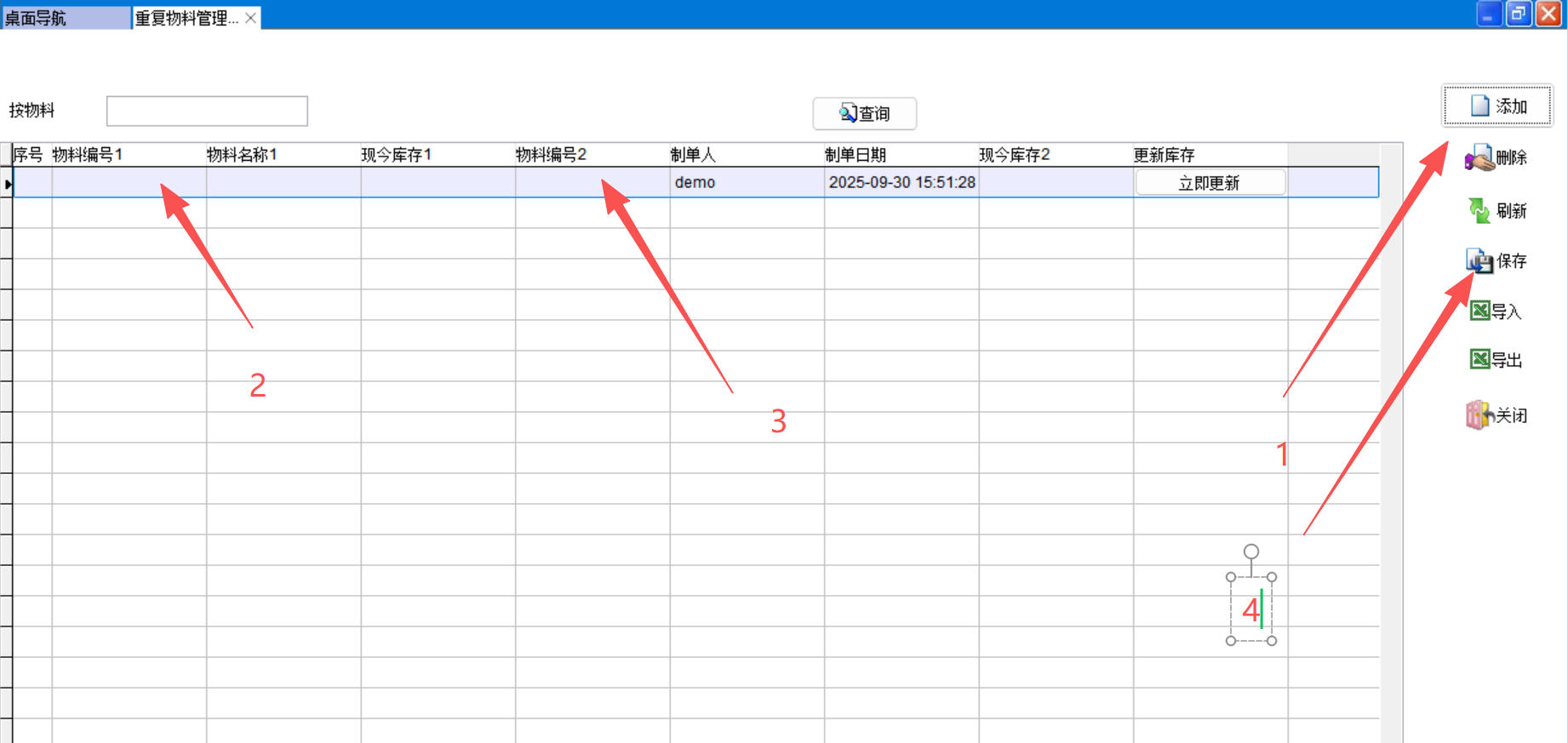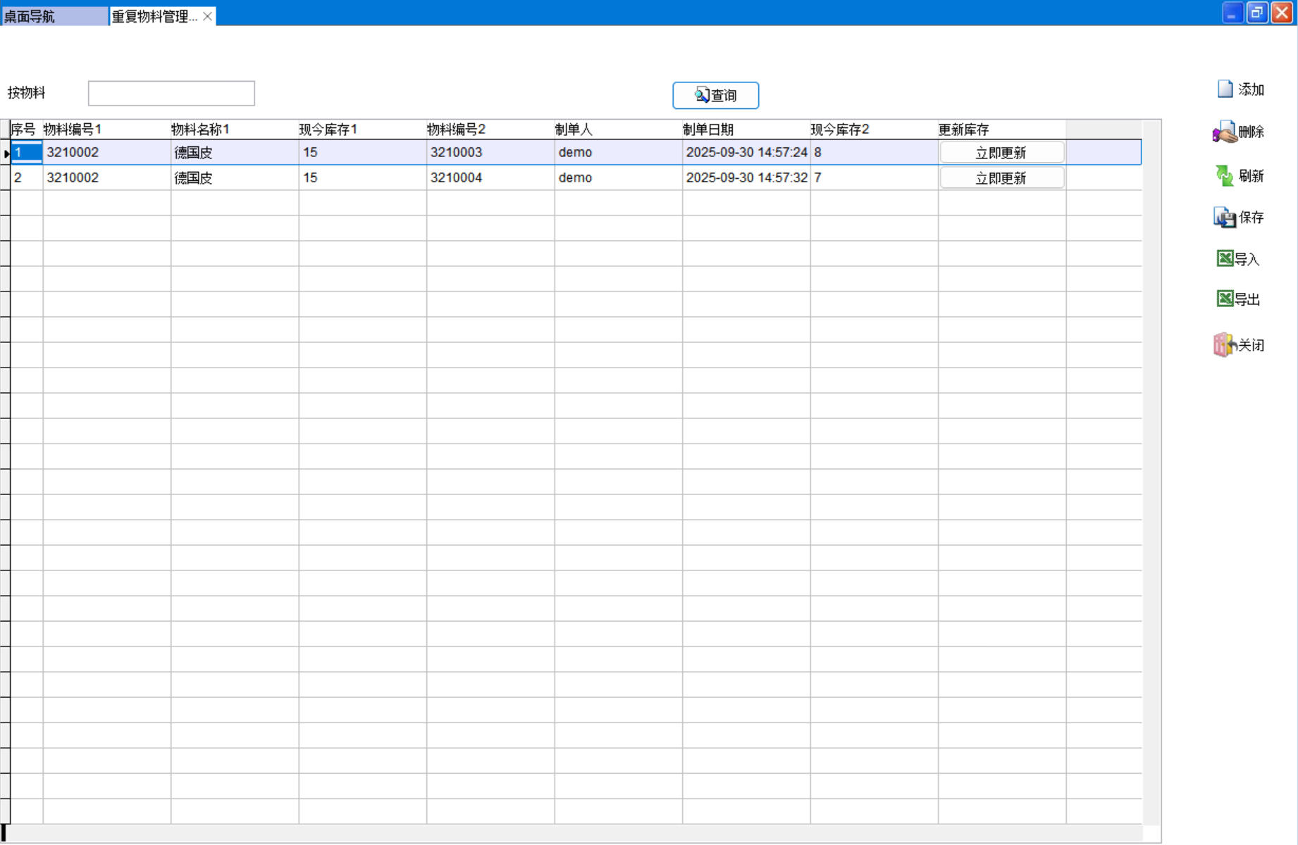 3、在物料編號2上直接輸入物料編號或雙擊選擇一個物料,物料編號2和物料編號1就是重復的物料