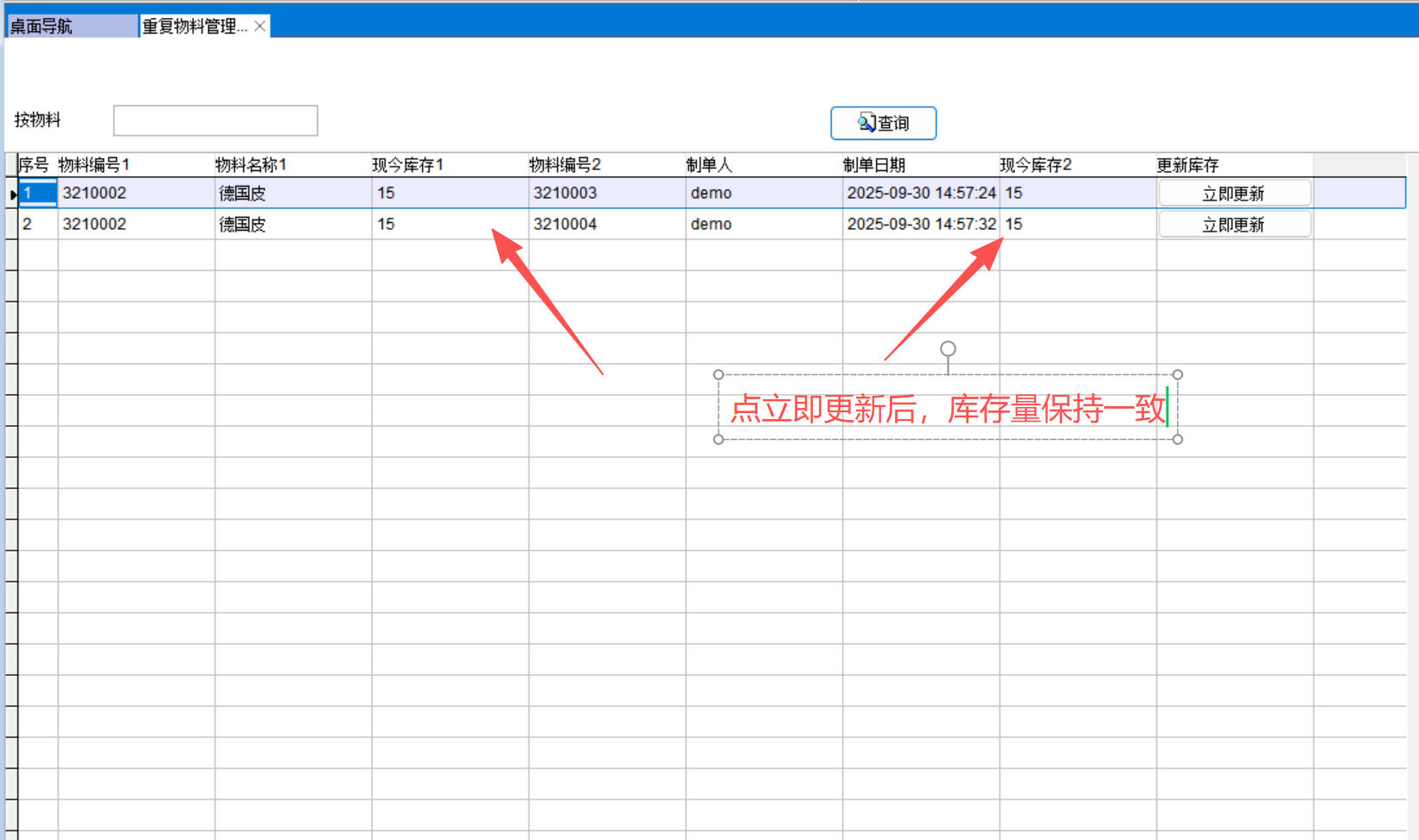 如上圖所示,3210002、3210003、3210004是同一個物料,名稱都相同,保存后在更新庫存上點立即更新,更新后3個物料的庫存就會保持一致,以后任意一個物料的出入庫后,其他兩個物料也會同步庫存量。3個物料會始終保持庫存一致。