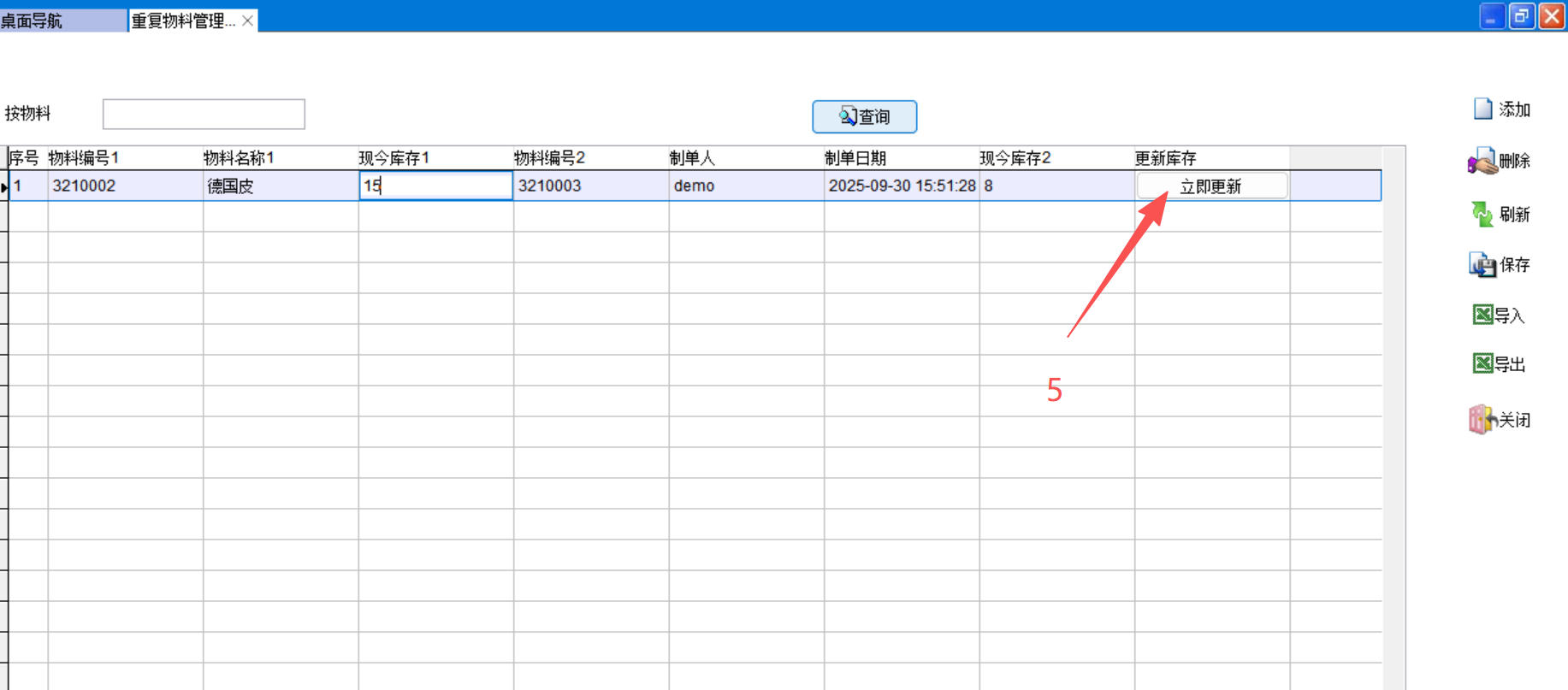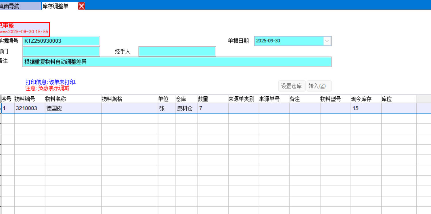 點立即更新后系統會自動生成一個庫存調整單,將物料編號2的庫存數量調整和物料編號1一致。