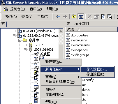 12、在表上點擊右鍵,選擇所有任務,選擇導入數據,如下圖所示: