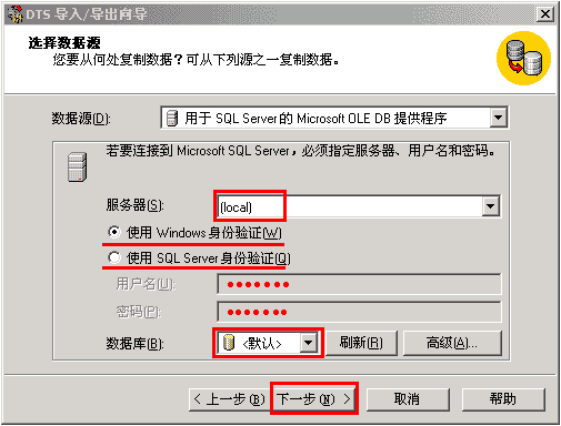 7、按下圖所示,按您的訂單中顯示的SQL用戶名和密碼,分別填寫后,點下一步;