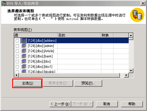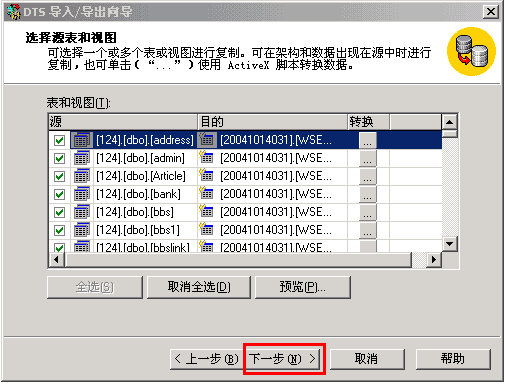 17、選擇您想要導入的表、視圖等數據內容,如下圖所示: