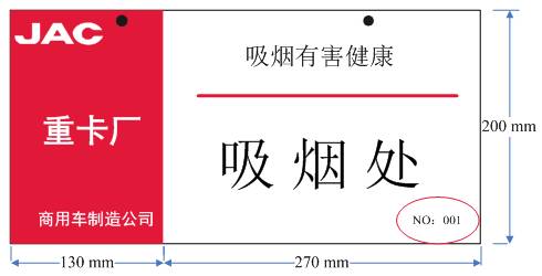 3.字體:廠名:黑體加粗,80PT;制造公司名:黑體加粗,40PT;吸煙有害健康:宋體,60PT;吸煙處:黑體加粗,140PT;編號:TimesNewRoman,30PT。