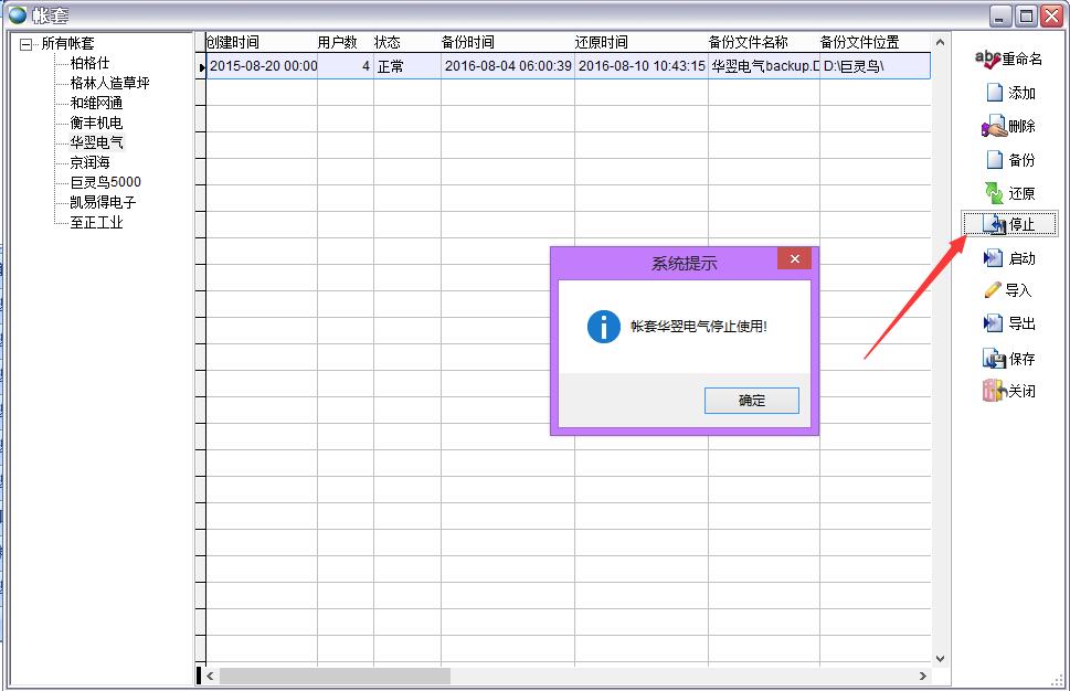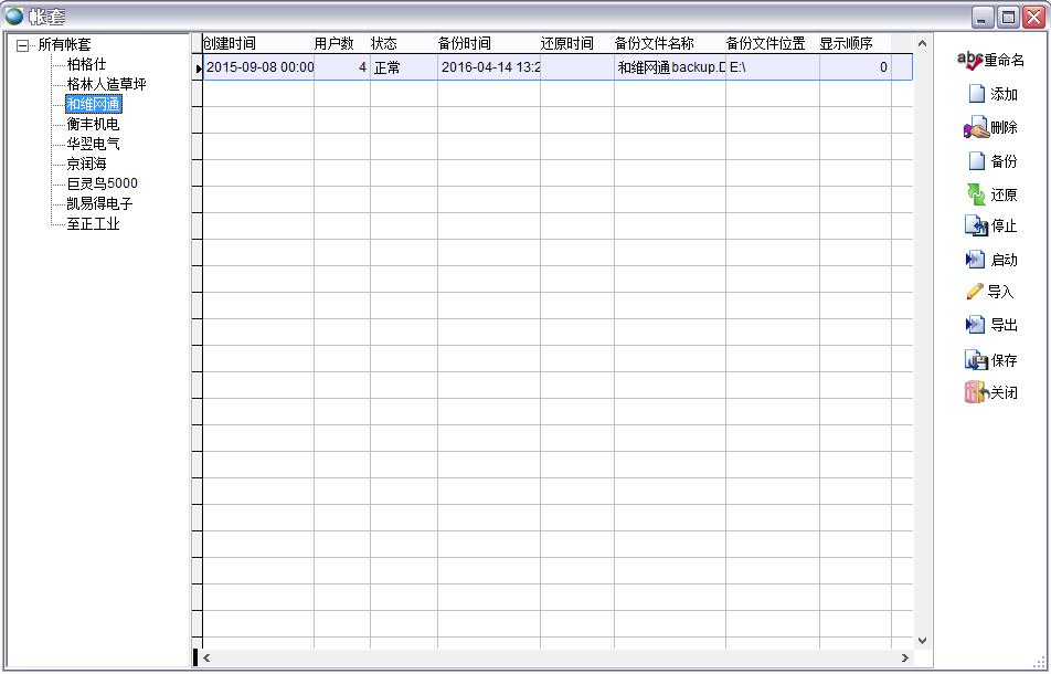 在左側(cè)選擇一個賬套,右側(cè)會顯示該賬套的一些信息,包括用戶數(shù)量、賬套創(chuàng)建時間、賬套最新備份時間、賬套備份的位置、賬套當前的狀態(tài)(正常使用或停用)