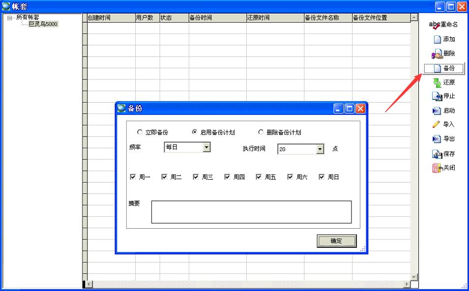 點擊要備份的帳套,點擊【備份】,選擇存放的服務(wù)器目錄即可。帳套的備份文件為.dat結(jié)尾的文件。
