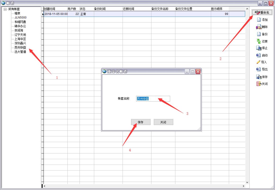 帳套打開路徑:【主菜單】->【系統(tǒng)管理】->【帳套】 注意:請在服務(wù)端進行帳套的建立、刪除、改名、備份操作,客戶端只能進行查詢
