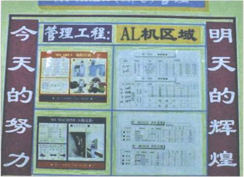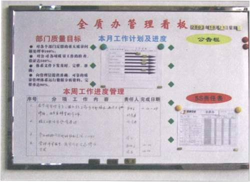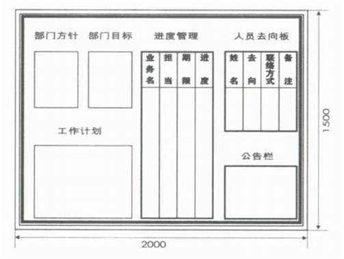 1.制作管理看板,內容包括:部門年度方針戰略、年度目標、每月計劃、進度管理、人員去向、公告欄,如圖所示。