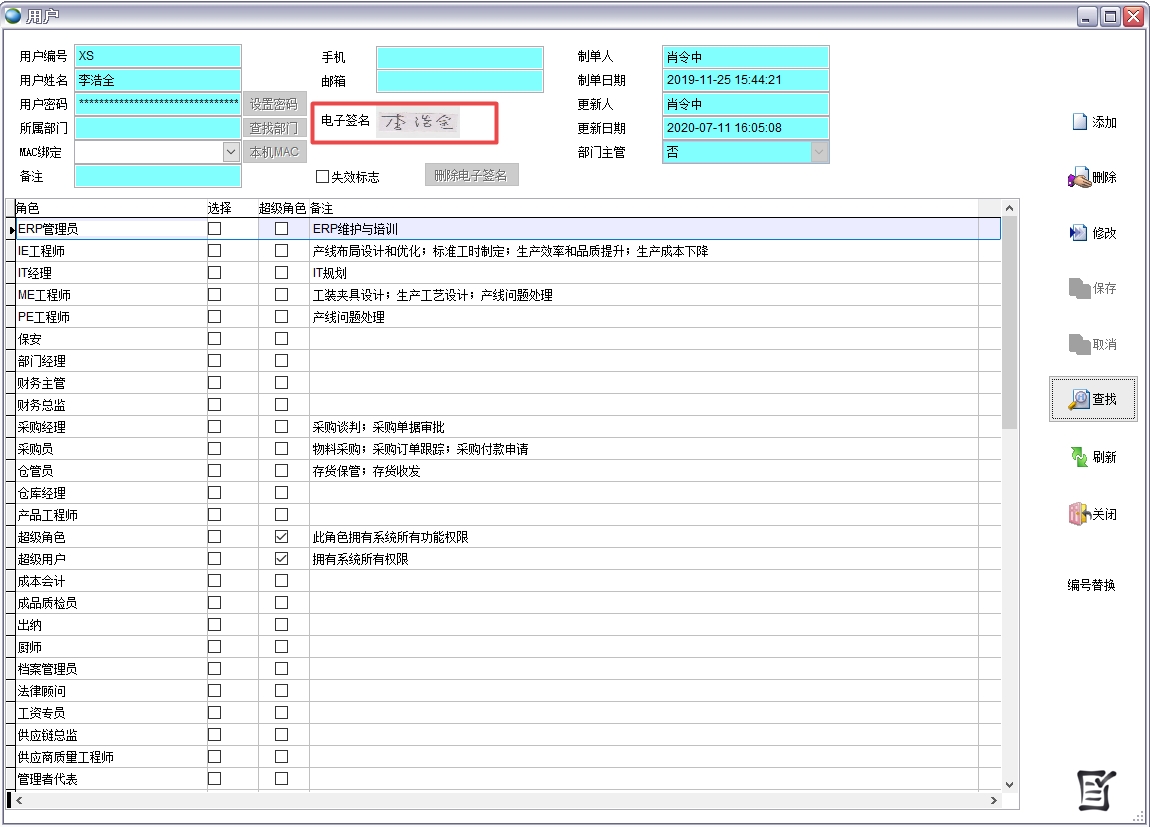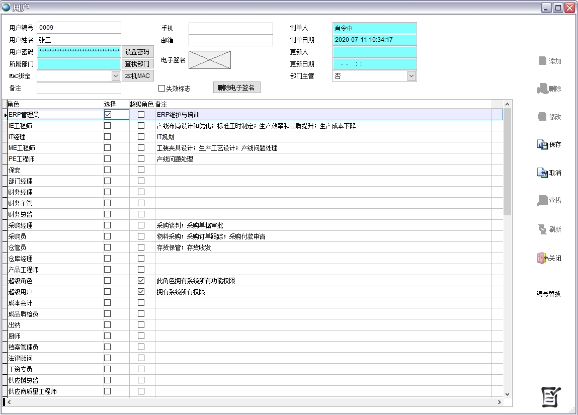 選擇【系統管理】->【權限】->【用戶】,點擊【添加】,輸入用戶編號、用戶姓名、用戶密碼、所屬部門,勾選所屬角色,點擊【保存】。