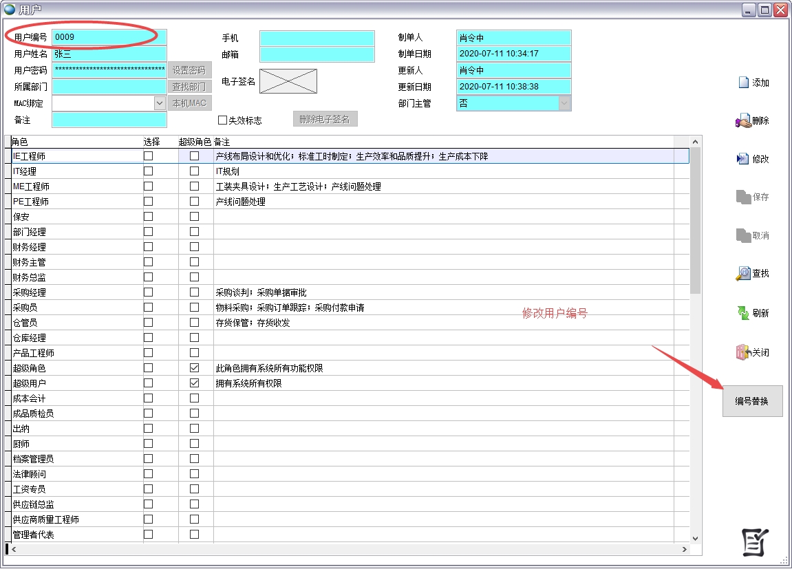 用戶建立后是不可以修改用戶編號的,如果需要修改可以使用編號替換