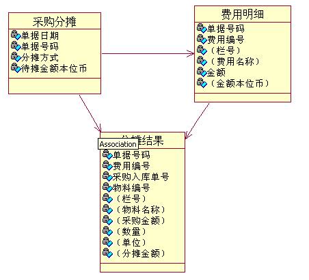 分攤結果:欄號、采購入庫單號、物料(編號、名稱)、采購金額、數量、單位、分攤金額 關聯:采購入庫單——采購入庫單號、物料主文件——物料編號 |