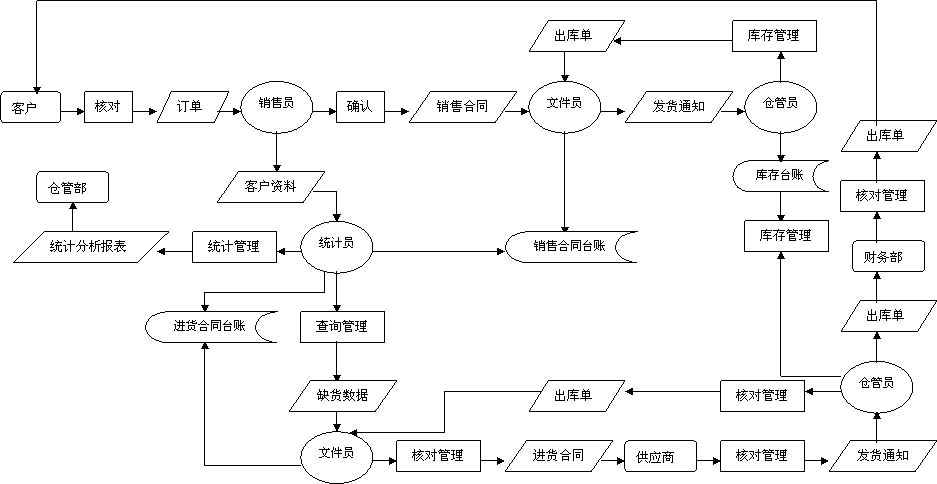 業(yè)務(wù)流程分析可以幫助我們了解某項業(yè)務(wù)的具體處理過程,發(fā)現(xiàn)和處理系統(tǒng)調(diào)查工作中的錯誤和疏漏,修改和刪除原系統(tǒng)中不合理部分,在新系統(tǒng)基礎(chǔ)上優(yōu)化業(yè)務(wù)處理流程,F(xiàn)通過調(diào)查,采用系統(tǒng)流程圖的部分圖形工具來規(guī)范說明公司的業(yè)務(wù)活動。業(yè)務(wù)流程圖中的符號說明如圖2.2所示,業(yè)務(wù)流程如圖2.3所示: