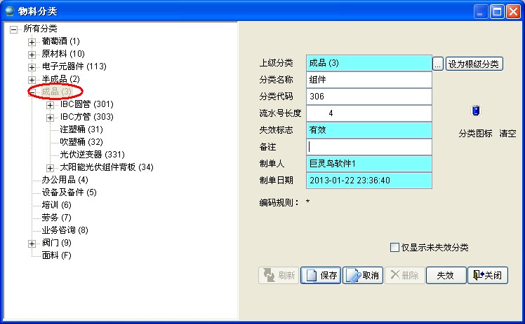 在左側(cè)樹(shù)狀圖中選中需添加下級(jí)分類(lèi)的分類(lèi),如下圖,需在成品下添加下級(jí)分類(lèi)組件。成品編號(hào)是以3開(kāi)頭,組件編號(hào)是以306開(kāi)頭,流水號(hào)4位,則最終生成的編碼從3060001到3069999。