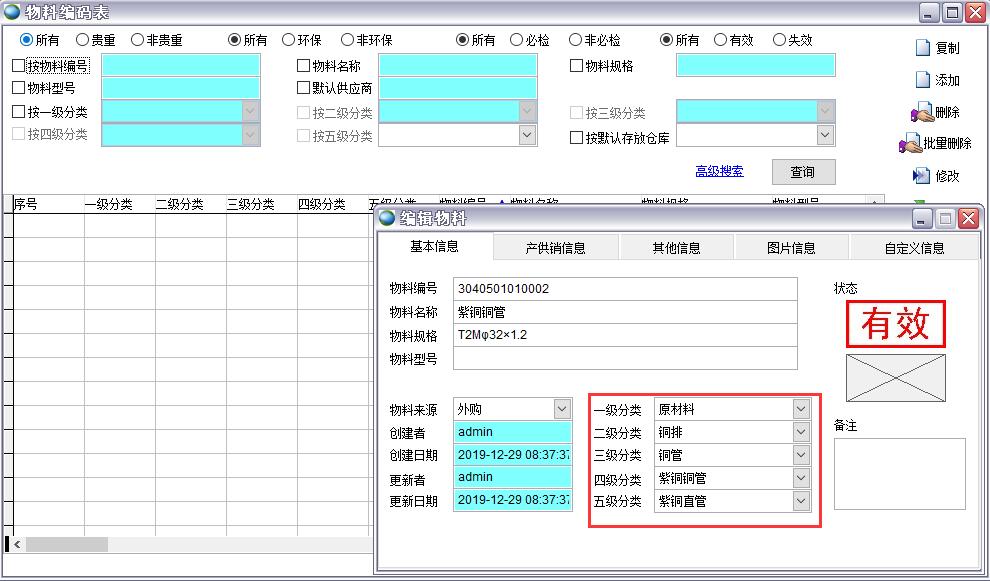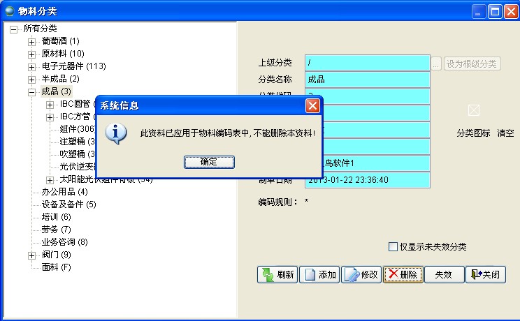 必須將要?jiǎng)h除的分類(lèi)的所有子類(lèi)都刪除后才能刪除此分類(lèi)。此分類(lèi)已存在物料編號(hào)時(shí)無(wú)法刪除,辦法只有兩個(gè):1、刪除所有此分類(lèi)的物料編號(hào)或改為其他分類(lèi);2、將此分類(lèi)失效,失效后的此分類(lèi)無(wú)法分配物料編號(hào)。