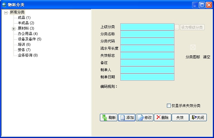 在巨靈鳥(niǎo)ERP中默認(rèn)的分類(lèi)為:成品、半成品、原材料、辦公用品、設(shè)備及備件、培訓(xùn)、勞務(wù)、業(yè)務(wù)咨詢(xún)