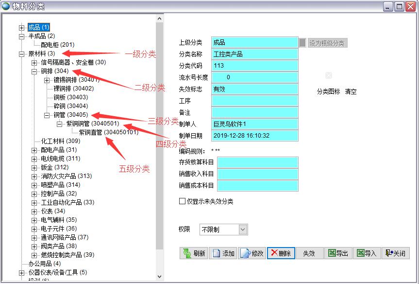 最頂層分類(lèi)為一級(jí)分類(lèi),一級(jí)分類(lèi)的下級(jí)分類(lèi)為二級(jí)分類(lèi),以此類(lèi)推。在一級(jí)分類(lèi)中,成品、半成品、原材料是不能刪除的,因?yàn)樵谝恍﹫?bào)表和查詢(xún)中都會(huì)直接用到成品、半成品、原材料這3個(gè)分類(lèi),如查找現(xiàn)今庫(kù)存