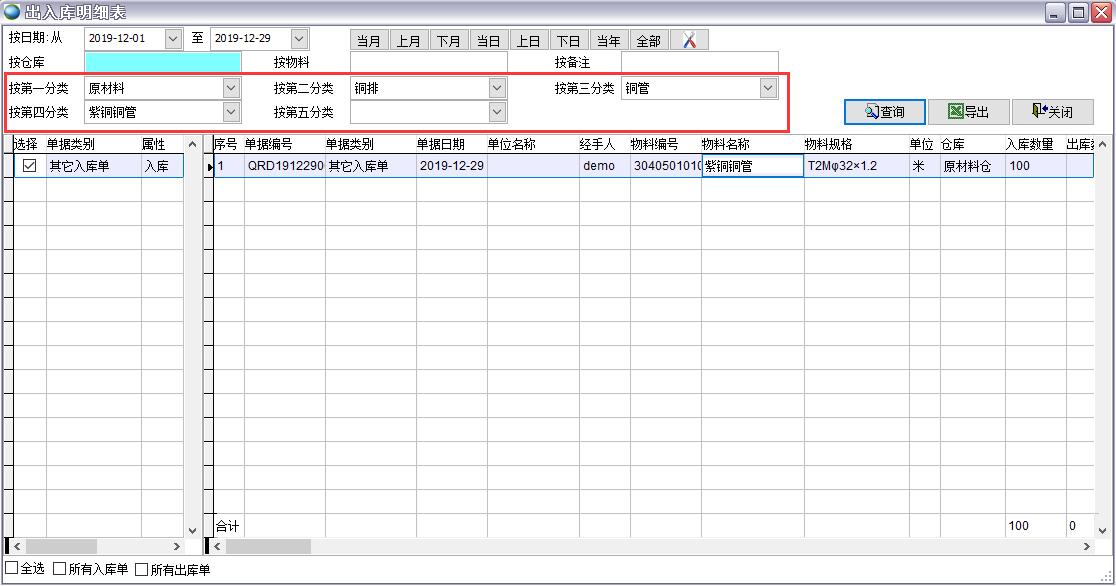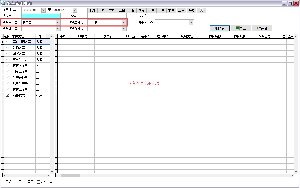 如上圖所示禁止這些部門(mén)查看化工焦類(lèi)別的物料信息,那么下面這個(gè)用戶屬于辦公室的,她就無(wú)法在物料編碼表、現(xiàn)今庫(kù)存、所有出入庫(kù)單據(jù)、庫(kù)存的各種報(bào)表中看到化工焦類(lèi)別的物料數(shù)據(jù)。