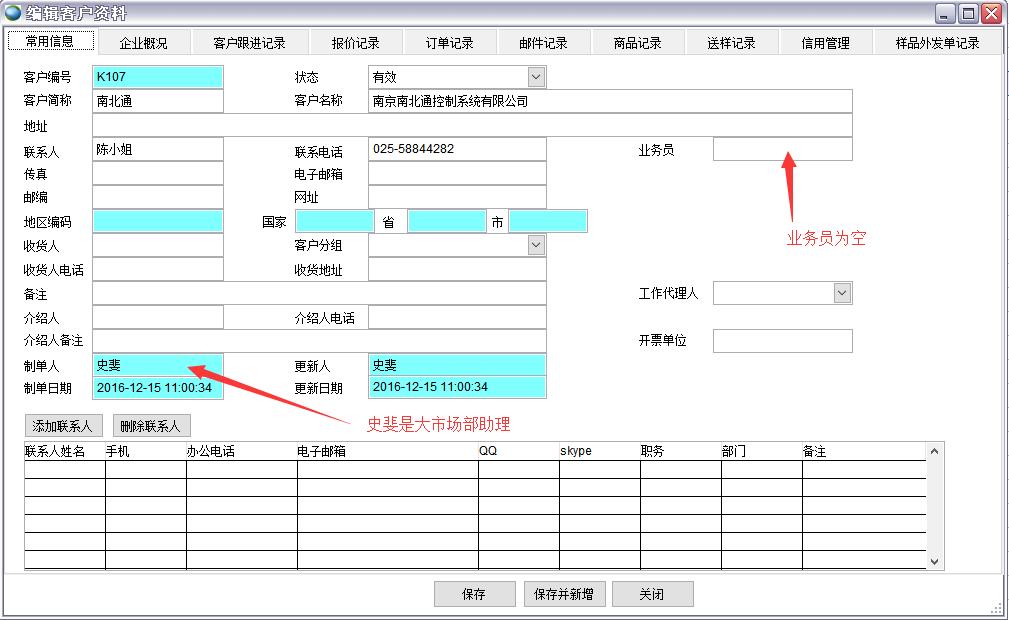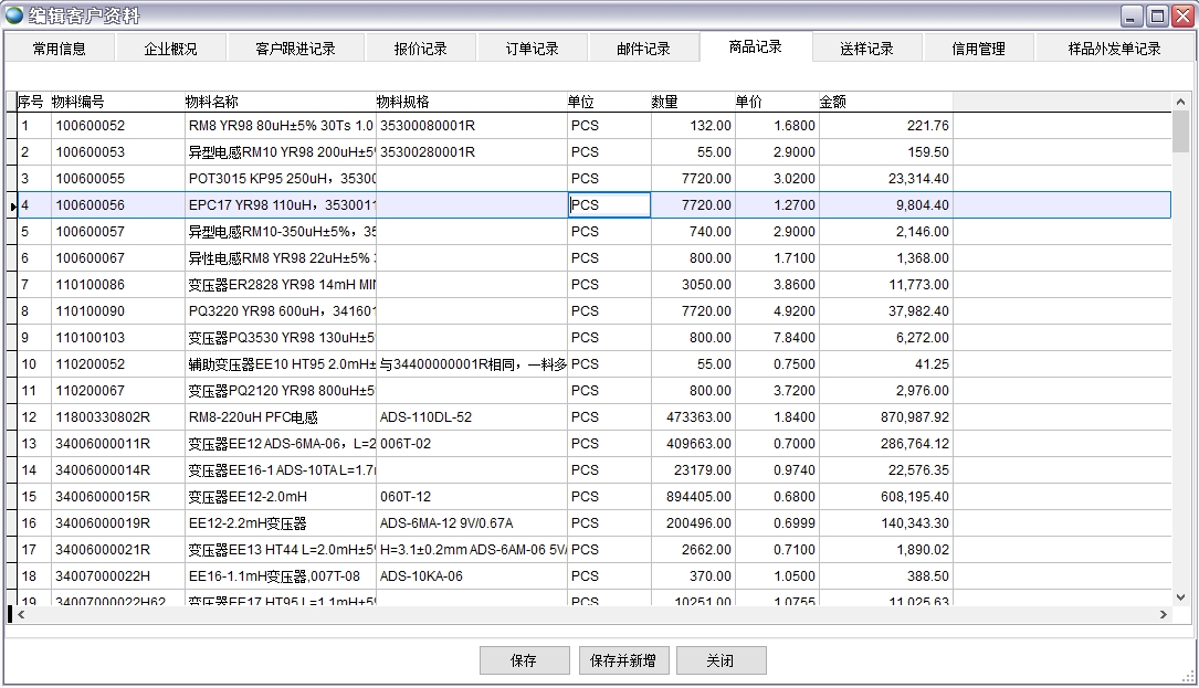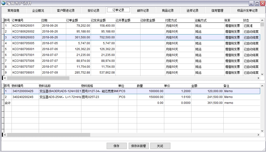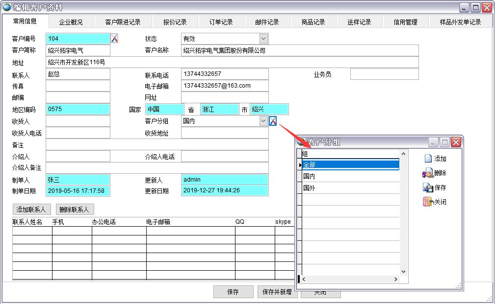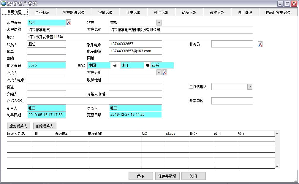 可以在客戶資料表中查看該客戶所有的交易記錄,包括郵件、客戶訂單、銷售過的產品、往來郵件、報價記錄、送樣記錄等