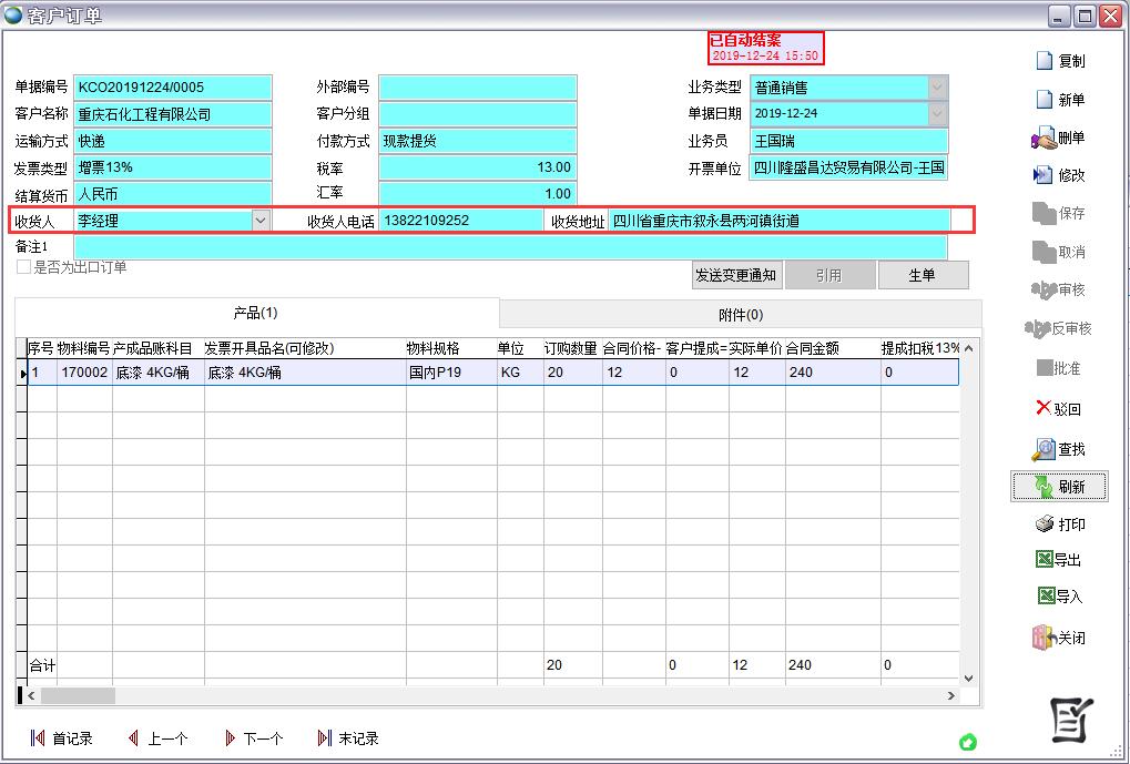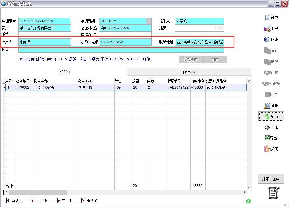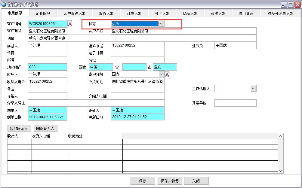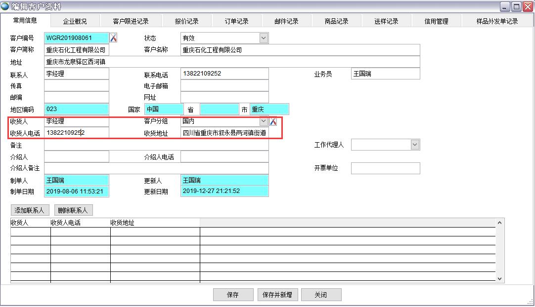 在客戶資料表中填寫的收貨人、收貨人電話、收貨地址可以被客戶訂單、銷售發貨單引用,如果客戶資料表中收貨信息空白,則在客戶訂單或銷售發貨單中手工填寫。