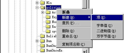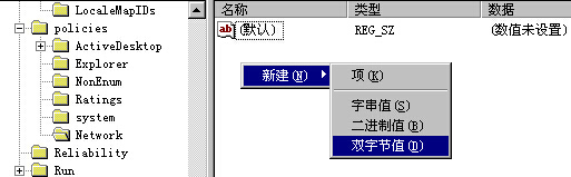 然后進入主鍵: HKEY_LOCAL_MACHINE\Software\Microsoft\Windows\CurrentVersion\Policies 新建Network子鍵(項) 在右側(cè)窗口中新建(右鍵選擇“新建”)一個名為AlphanumPwds的雙字節(jié)(操作系統(tǒng)的不同,出來的菜單可能有不同,Dword同樣表示雙字節(jié))值,(右鍵選擇”新建”) 數(shù)值為1即可。