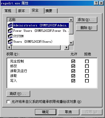 四、系統(tǒng)文件權限的分類 當要給文件設置權限的時候,要首先保證該分區(qū)格式為NTFS(Windows NT的文件系統(tǒng)),當然你也可以使用文件分配表(FAT)格式,但是FAT文件系統(tǒng)沒有對文件的訪問權限加以任何限制,F(xiàn)AT只在那些相對來講對安全要求較低的情況下使用。在NTFS文件系統(tǒng)中,可以使用權限對單個文件進行保護,并且可以把該權限應用到本地訪問和網(wǎng)絡訪問中。在NTFS文件系統(tǒng)上,可以對文件設置文件權限,對目錄設置目錄權限,用于指定可以訪問的組和用戶以及允許的訪問等級時。 如果實施了NTFS的文件系統(tǒng)格式,可通過系統(tǒng)的資源管理器直接來管理文件的安全,設置目錄或文件的權限。 以regedit.exe文件為例,右鍵選擇“屬性”, 在“安全”標簽里面選擇不同組的名稱,就可以更改配置他們對該文件的操作權限。 基于文件級的權限可以分配下面幾種:讀取(用戶可以讀取該文件的內(nèi)容),寫入(用戶可以寫入數(shù)據(jù)到該文件中),讀取及執(zhí)行(用戶可以執(zhí)行該程序),修改(用戶可以修改該文件內(nèi)容,包括刪除),完全控制(以上所有權限都有)。因此,適當?shù)貫椴煌瑱嘞薜膸ぬ柗峙湎鄳脑L問權限(在”允許”,”拒絕”欄分別打勾,如下圖)對于文件系統(tǒng)的安全是致關重要的。