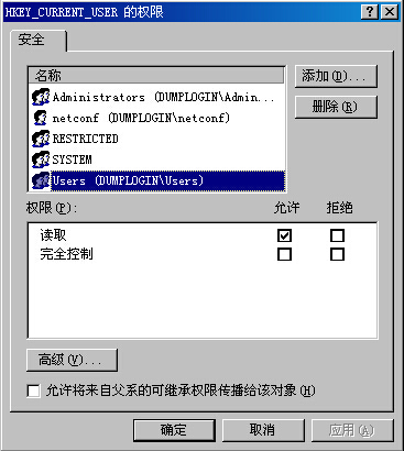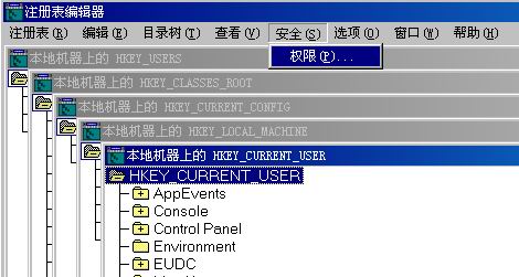 五、如何保護注冊表的安全 Windows NT/2000中的注冊表(Registry)是一系列的數(shù)據(jù)庫文件,主要存儲在 系統(tǒng)安裝目錄\ System32\Config下,有些注冊表文件建立和存儲在內(nèi)存中,這些文件的備份也存儲在 系統(tǒng)安裝目錄\Repair下。由于所有配置和控制系統(tǒng)數(shù)據(jù)最終都存在于注冊表中,而且Registry的缺省權限設置是對“所有人”“完全控制”(FullControl)和“創(chuàng)建”(Create),這種設置可能會被惡意用戶刪除或者替換掉注冊表(Registry)文件。所以,如果注冊表權限沒有設置好的話,整個 Windows NT/2000的系統(tǒng)就不安全,因此我們必須控制注冊表的訪問權。 對于注冊表(Registry),建議應嚴格限制只能在本地進行注冊,不能被遠程訪問,限制對注冊表(Registry)編輯工具的訪問。具體可以利用文件管理器設置只允許網(wǎng)絡管理員使用注冊表編輯工具regedit.exe或regedt32.exe,其他任何用戶不得使用;還可使用第三方工具軟件,比如Enterprise Administrator (Mission Critical Software)來鎖住注冊表(Registry)。或者把對注冊表缺省的所有用戶都能“完全控制”的權利改成只能“讀取”。 在“開始”“運行”里面輸入regedt32如下圖: 假設我們將HKEY_CURRENT_USER支更改成一般用戶只能讀,在菜單中選擇“安全”“權限” 如下圖: 選擇組用戶users(在win2000系統(tǒng)中默認uers是一般用戶,如果在上面列表中沒有定義users組權限,可以選擇”添加”按紐,將該組進行權限設置)