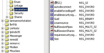 我們打開注冊表(見第二章第一節第二知識點圖示,以下同)。 在主鍵HKEY_LOCAL_MACHINE\System\CurrentControlSet\Services\LanmanServer\Parameters目錄下,創建一個叫AutoShareServer的鍵值,類型為DWORD(雙字節)并且值為0,來禁止這些共享;再創建一個鍵值名為AutoShareWks的雙字節值,修改鍵值為0。