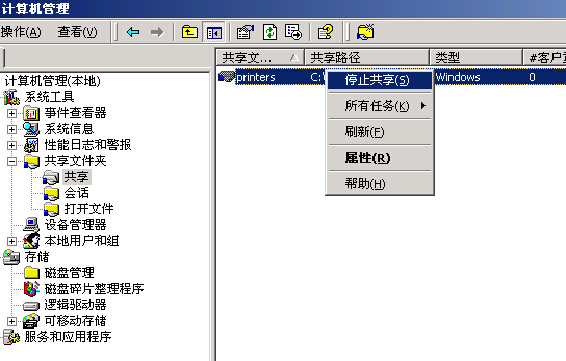最后,請重新啟動計算機生效。 同樣可以通過控制面板里面的管理工具來暫時取消共享。選擇“計算機管理”程序,選擇“共享文件夾”,在相應的共享文件夾上按右鍵,選擇“停止”共享即可。不過在系統重新啟動后,IPC$ 和printer$會再次共享。