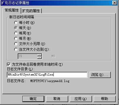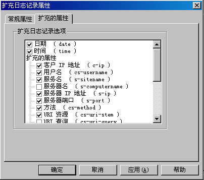 “新日志時間間隔”意思是每隔多長時間系統(tǒng)日志單獨寫成新的一個文件,比如:選擇“每天”,那么每天在日志文件目錄下就會多一個新的文件,該文件內(nèi)容主要是記錄當(dāng)天的訪問記錄。 還可以選擇按大小來拆分,選擇:“當(dāng)文件大小達到”一定大小的時候,才會生成一個新的文件,系統(tǒng)默認是每天單獨記錄在一個文件里。 在“擴充的屬性”里面,允許用戶選擇記錄哪些內(nèi)容以及格式等。
