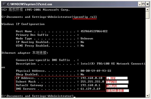 圖6-03 在光標(biāo)閃動(dòng)出輸入 ipconfig /all 直接回車(chē),可查看得到本機(jī)的IP地址相關(guān)信息,記下這個(gè),接下來(lái)將用到