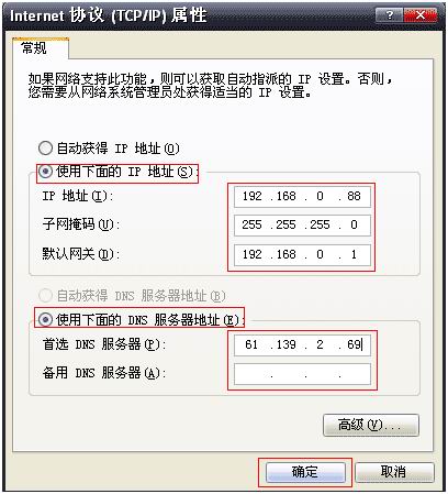 第八步:選擇【使用下面的IP地址】,輸入IP地址,將以上介紹的第三步看到的【ip地址】、【子網(wǎng)掩碼】、【默認(rèn)網(wǎng)關(guān)】、【首選DNS服務(wù)】數(shù)值,分別輸入以上對(duì)應(yīng)的框框,在這里特別說(shuō)明一下【IP地址】最后的一個(gè)值,我們一般輸入容易記住的數(shù)值(在2-254的自然數(shù)中選擇一個(gè)),并記住這個(gè)IP地址,這個(gè)就是其他客戶(hù)端登陸需要的地址,如下圖6-08