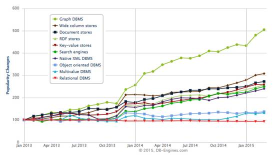 但是從數據庫類型上看,回顧歷史,我們會得到驚人的發現。下面是自2013年2月開始,不同數據庫類型的發展情況。從圖表中可以明顯地看出,圖型數據庫一馬當先,在過去兩年里,增長幅度高達5倍。研究機構Forrester最近的一項報告也預言,到2017年,圖型數據庫將占企業的25%。