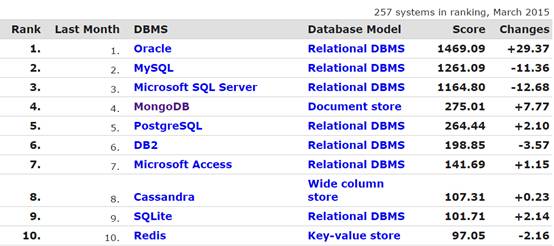 新的一年,我們繼續關注美國數據庫知識網站DB-engines發布的數據庫流行度排行榜。三月的榜單可以說是平淡無奇,前十名的名次都沒有變化。從積分上來看,只有Oracle增長了近30個積分,變化較大。可能受到了Oracle新一代集成系統發布的影響吧。
