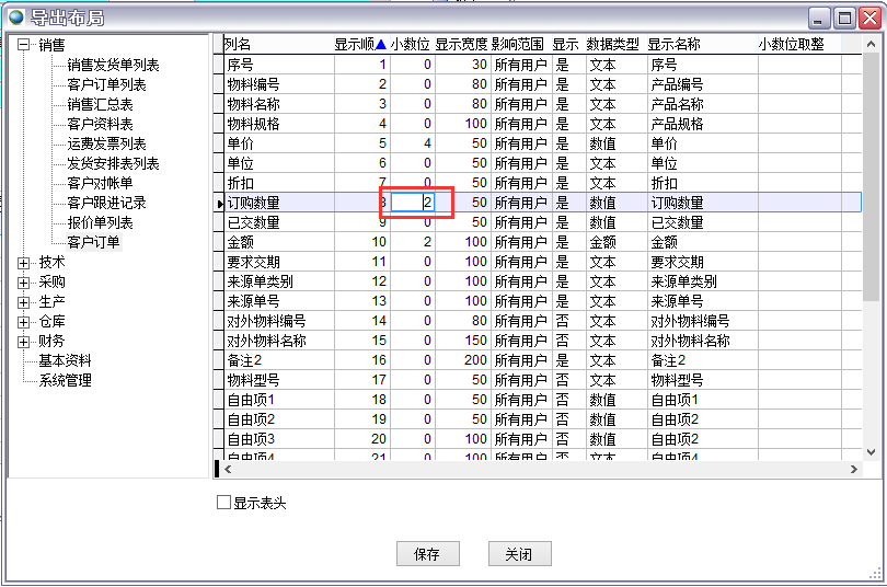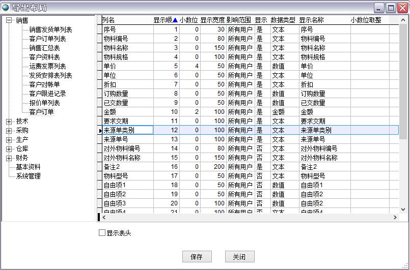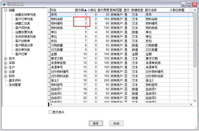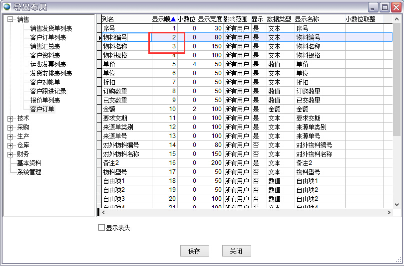 現在改變物料編號和物料名稱的顯示順序,保存導出布局。然后重新打開客戶訂單,此時物料名稱的顯示在物料編號之前。