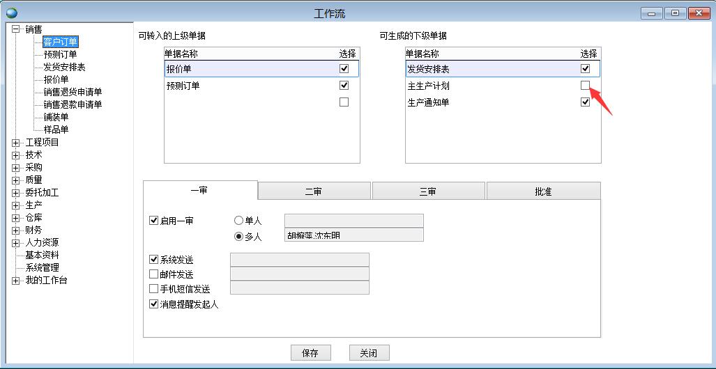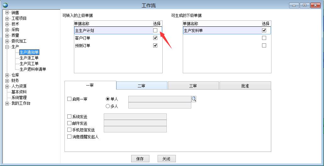 打開工作流,選擇生產通知單,去掉可轉入的上級單據中的主生產計劃