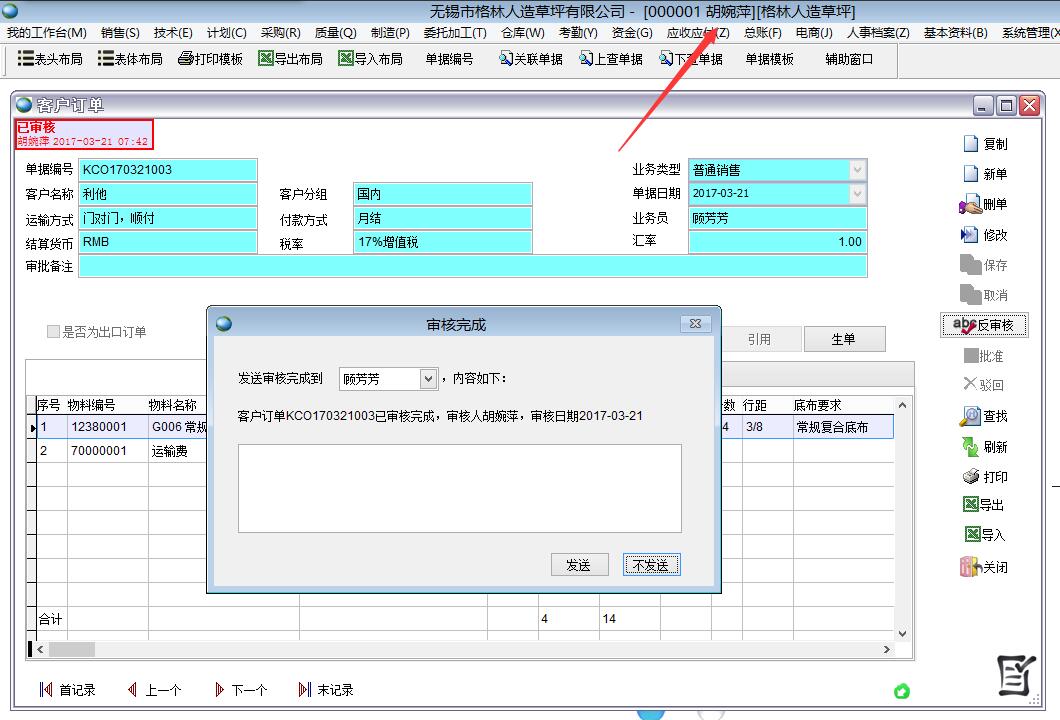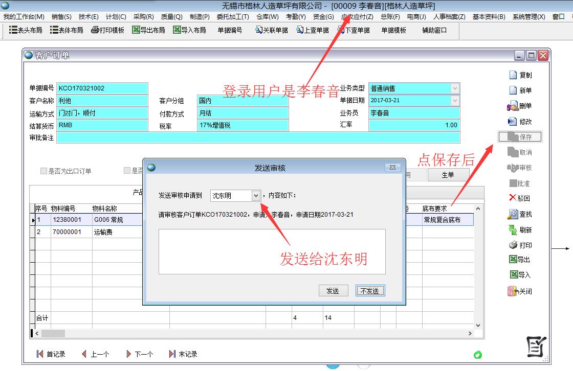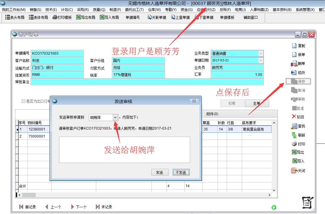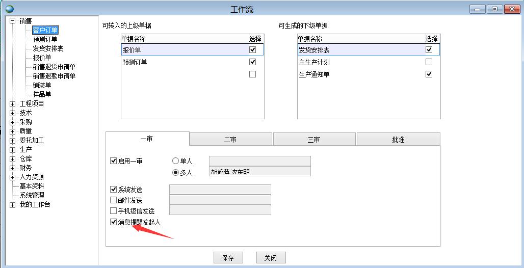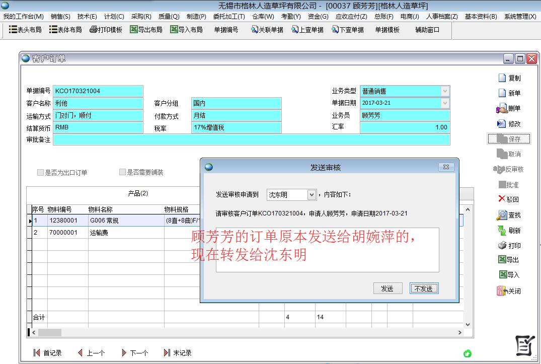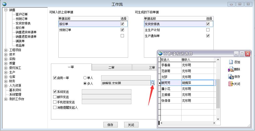上圖對客戶訂單的一審設置了多人審批,顧芳芳的訂單發送給胡婉萍審核,其他人員的訂單發送給沈東明審批