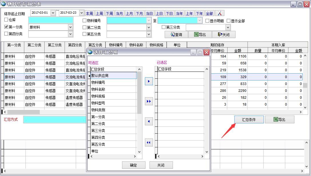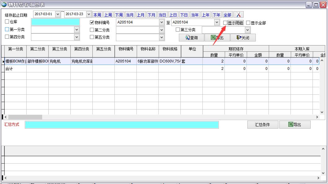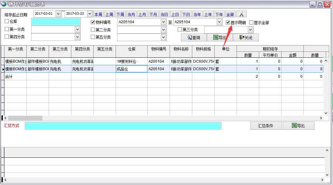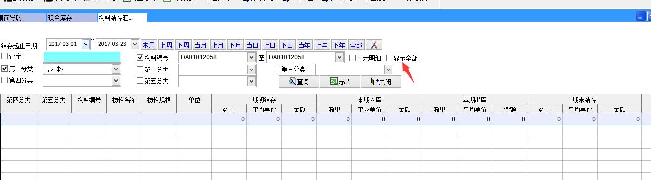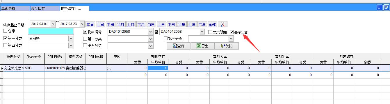 打開路徑:【主菜單】->【倉庫】-> 【報(bào)表】->【物料結(jié)存匯總表】