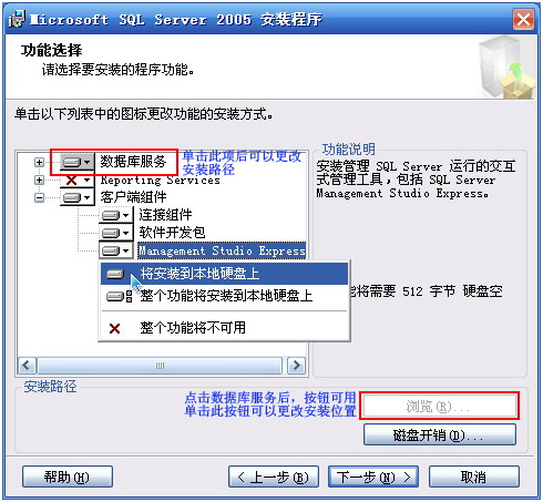 7.選擇所需組件,單擊“數據庫服務”后可以點擊“瀏覽”按鈕,更改安裝路徑