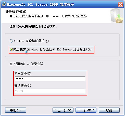 11.更改身份驗證模式,選擇混合模式,輸入sa的登錄密碼