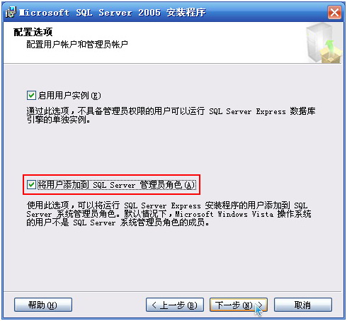13.配置用戶賬戶和管理員賬戶,選擇“將用戶添加到 SQL Server 管理員角色”