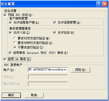 5.發布服務器和訂閱服務器都要設置MSDTC ,允許網絡訪問控制面板--->管理工具--->組件服務--->計算機--->我的電腦(Win7繼續找 -->Distributed Transaction Coordinator--->本地DTC),右鍵屬性,找到MSDTC選項卡,點擊安全設置,按如下設置即可)
